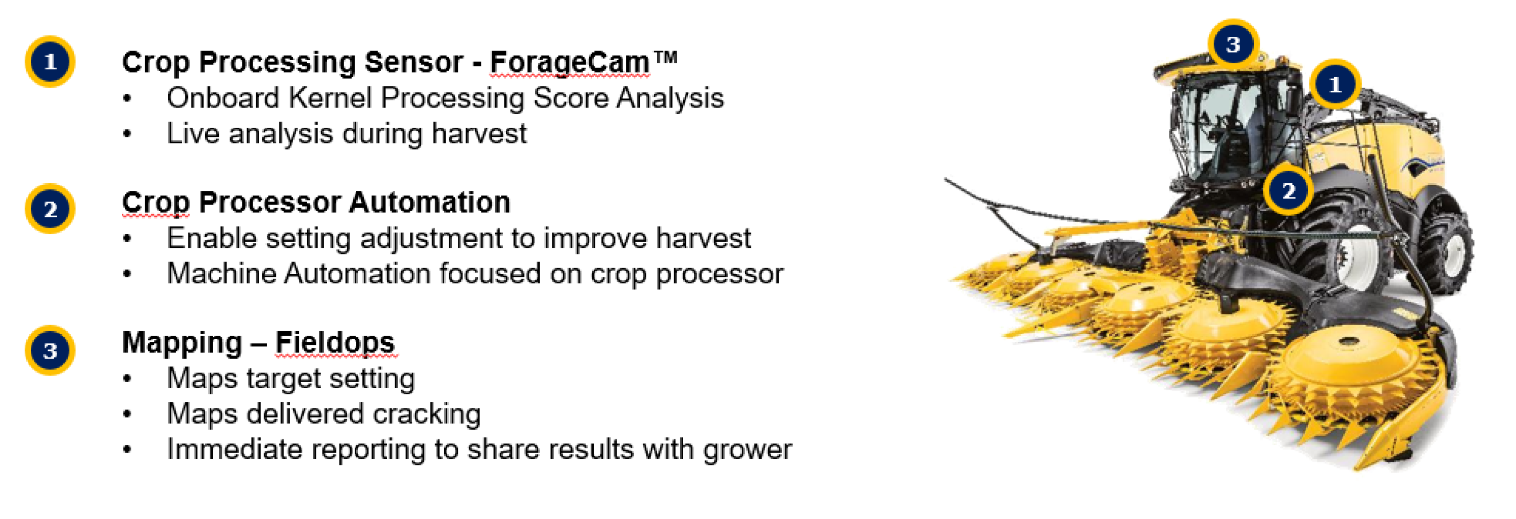 Bij het hakselen van mais moeten de korrels voldoende gekneusd worden om het aanwezige zetmeel goed verteerbaar te maken. Omdat dit kneusproces veel energie vraagt, dient de machine optimaal afgesteld te worden om een goede voerkwaliteit te bekomen met optimale machineprestaties. Op vandaag verloopt deze kwaliteitscontrole echter nog via bemonstering en labo-analyses, waarvan de resultaten pas na de oogst binnenkomen. De ForageCam™ van NEW HOLLAND analyseert de korrelverwerkingsscore reeds tijdens het oogsten op basis van beelden van de gehakselde maisstroom. Als de gemeten korrelverwerkingsscore afwijkt van de door de operator ingestelde waarde, worden de instellingen van de machine automatisch aangepast om de gewenste waarde te bereiken. Deze sensor stelt de hakselaar en de bestuurder dus in staat om reeds tijdens het oogsten in te grijpen door de machine-instellingen te optimaliseren om de gewenste voerkwaliteit op een efficiënte manier te bereiken.
